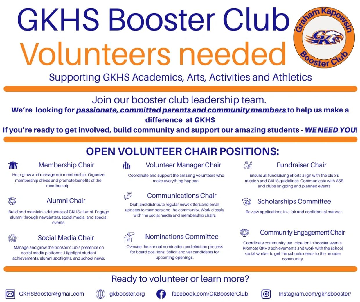 Whether you're a parent, guardian, alumni, or a proud community member, there's a place for you in the Booster Club. No experience required. No set time commitment. Just bring your passion for GKHS!